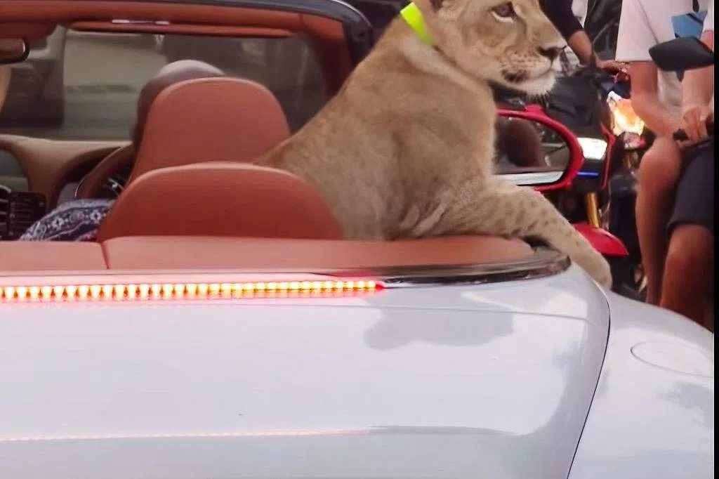 芭提雅有人养狮子当宠物 还开车“遛狮”