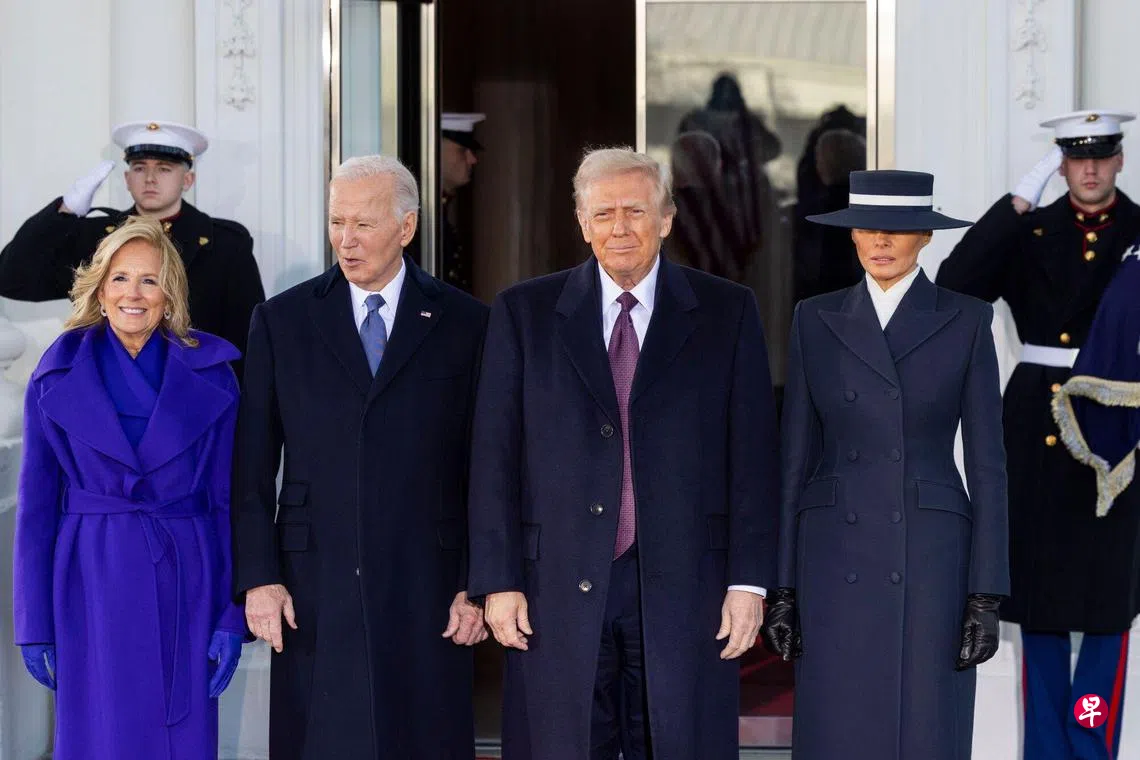 拜登与特朗普共同抵达国会大厦 准备权力交接左起:拜登和夫人吉尔与特朗普和夫人梅拉尼娅,在白宫合影。 (彭博社)美国候任总统特朗普与即将卸任的总统拜登,星期一(1月20日)一同乘车抵达国会大厦,进行权力交接。 特朗普提名的一些政府要员人选和美国主要政治人物,也陆续抵达会场。此前,特朗普和拜登与各自的配偶在白宫举行传统茶会。拜登和夫人吉尔在总统官邸前门欢迎特朗普,拜登对特朗普说:“欢迎回家。” 延伸阅读 特朗普夫妇抵达教堂 准备参加就职典礼祈祷仪式 特朗普或不立即推行激进关税政策 美元应声滑落 特朗普就职拜登特朗普国会大厦上一篇普京祝贺特朗普就任美国总统 愿就俄乌和核军备问题与美谈判下一篇王星事件影响中国“泰新马旅游团”购买此文章