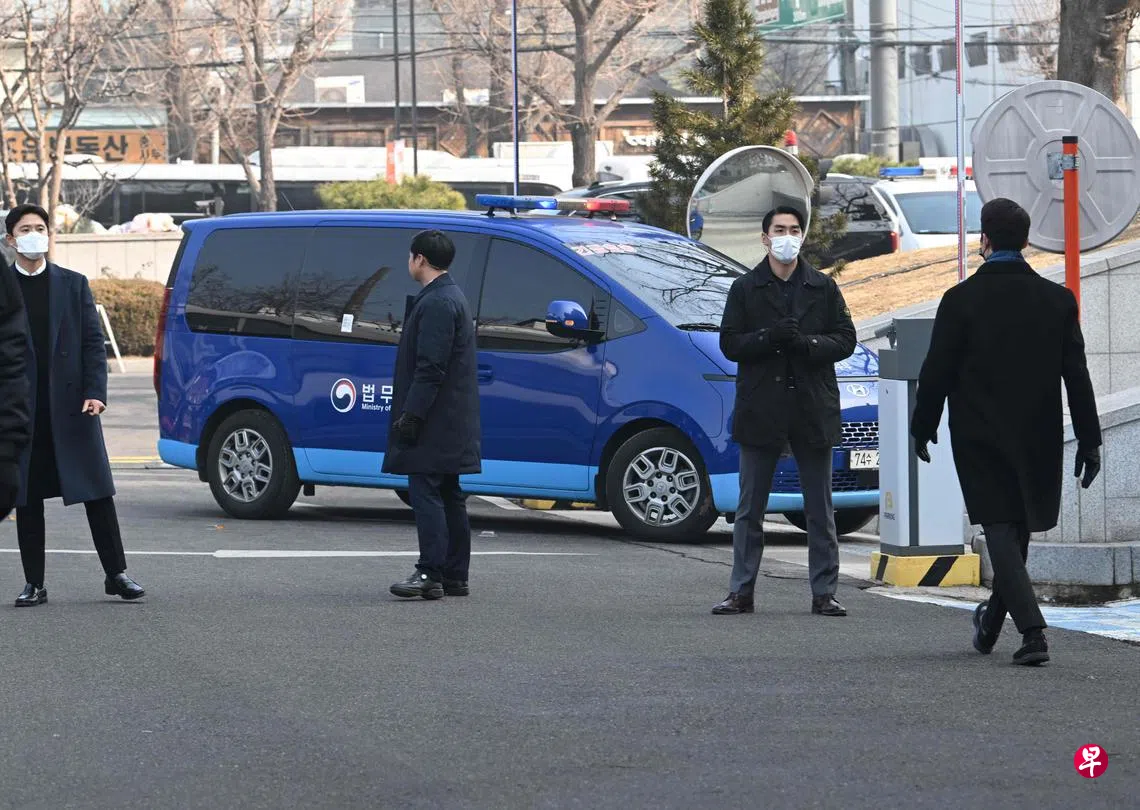 停职的韩国总统尹锡悦星期二(1月21日)乘车抵达宪法法院,出席总统弹劾案第三次正式辩论。