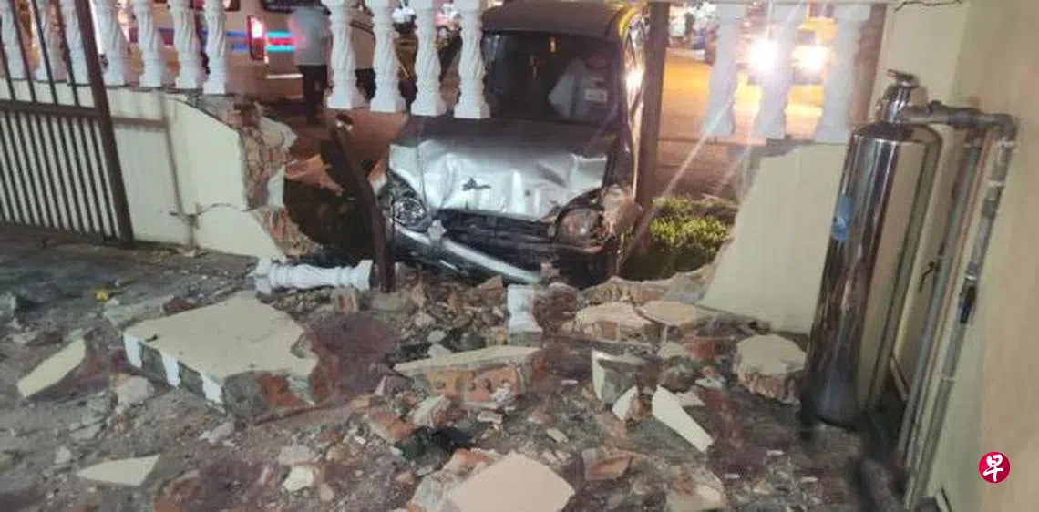马来西亚一辆轿车在加影区附近失控撞及一辆轿车后撞入一个住宅的围墙,66岁残障驾驶者当场死亡。