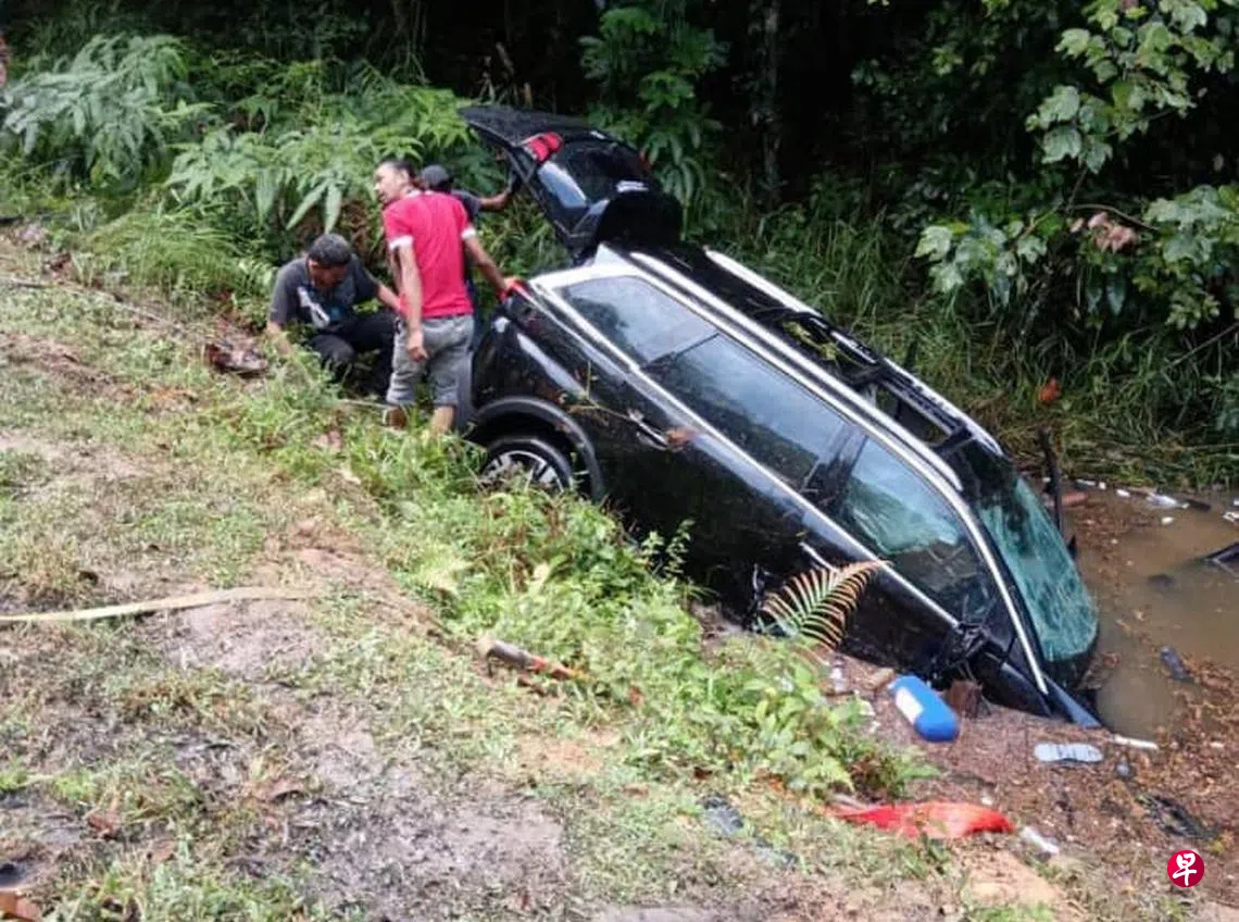 马来西亚柔佛州丰盛港发生致命车祸,两辆休旅车相撞,其中一辆失控冲入路旁大水沟后没顶,车内两名年迈男女当场不治。