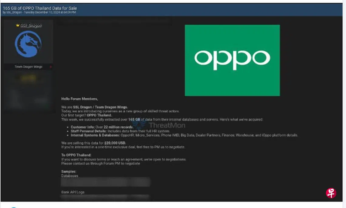 “鹰眼”星期四(1月23日)公布的暗网截图显示,销售的内容是据称来自Oppo泰国的数据。据报道,泄露的数据达165千兆字节(Gigabyte),包括客户和员工数据以及系统数据库等关键内部信息。使用化名“SSL_Dragon”的卖家索要2万美元(约2.7万新元,68万泰铢)。