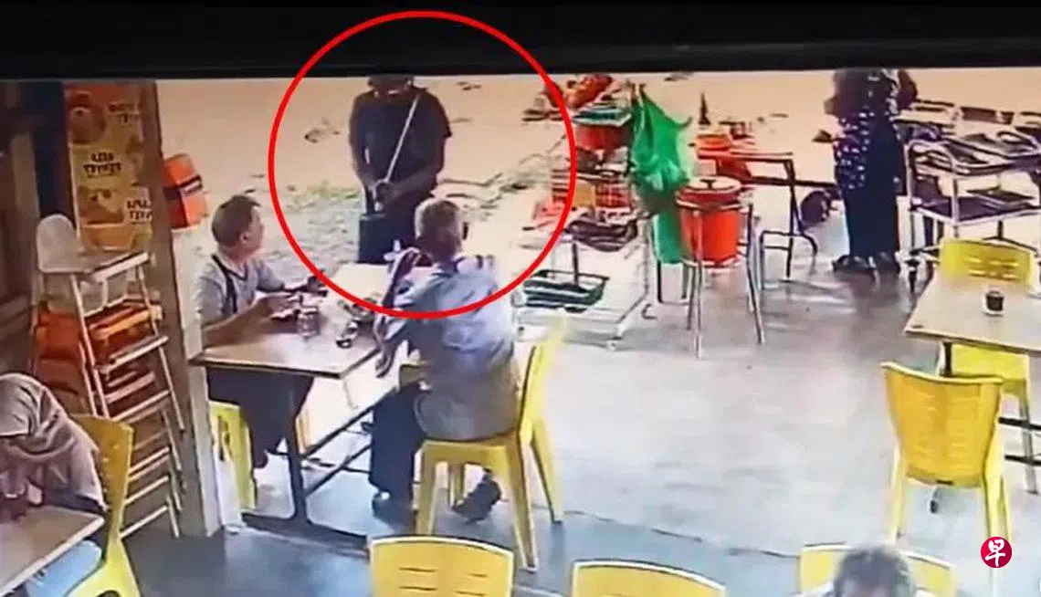 一名疑似当地男子的抢匪光天化日之下,手持巴冷刀进入马来西亚万津一家餐馆威胁一名正在用餐的男子交出财物,并在得手后立即驾车逃离现场。