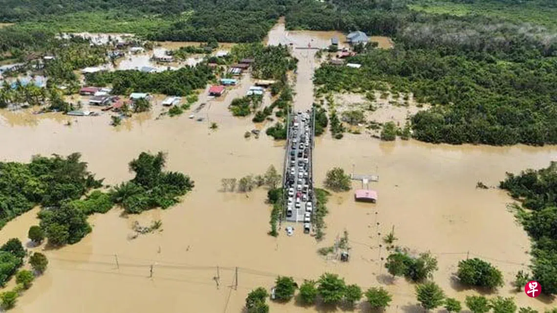 《中国报》报道,一场洪水导致从柏戈奴镇通往实务地镇的桥梁仅露出中间的部分,受困桥上的车辆进退两难。