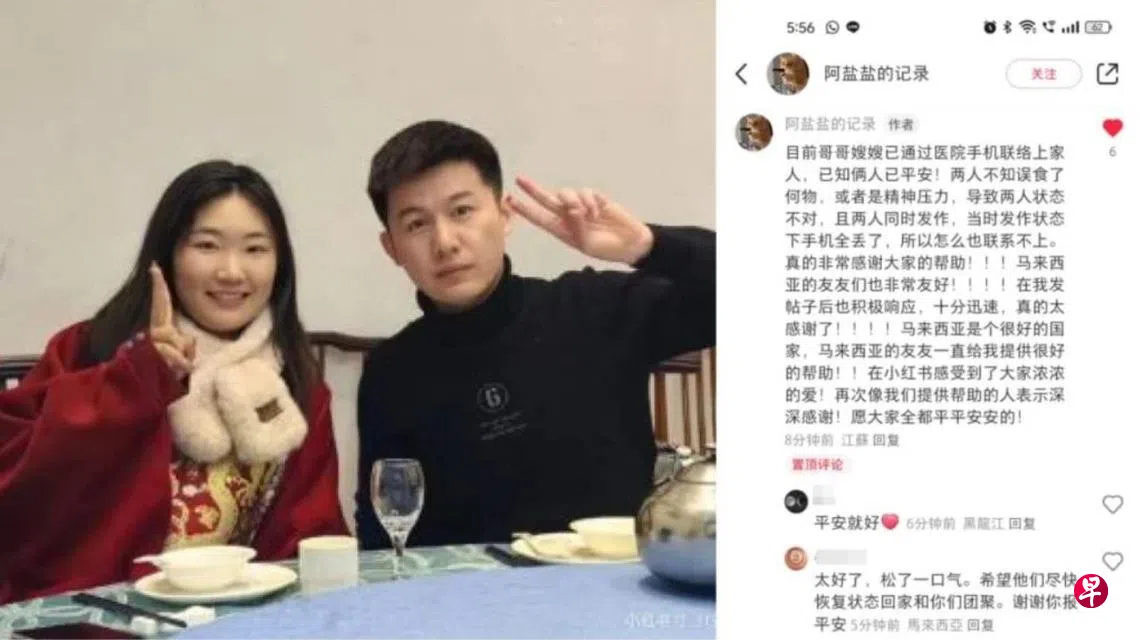 中国社媒应用小红书的网友“阿盐盐的记录”星期天(2月9日)发贴文称,哥嫂于2月3日从中国福建省福州市飞赴马国度假,两人原定于星期天从吉隆坡飞回国,但当天一直处于失联状态,家属格外担忧。