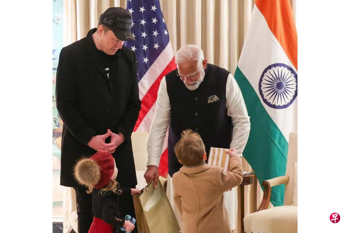 马斯克是美国太空探索技术公司(SpaceX)和电动车斯特拉的创始人,同时也是X的持有者。他周四牵着四岁儿子X和一对两岁的龙凤胎到美国总统国宾馆布莱尔宫(Blair House)与莫迪会面,随行的还有龙凤胎的母亲和一群保姆。会面期间,当马斯克向莫迪送赠礼物时,三个孩子围住了莫迪。