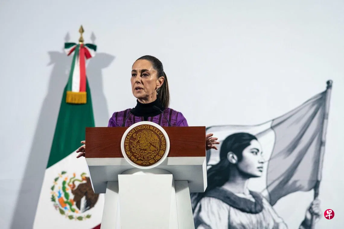 2月20日,墨西哥总统辛鲍姆在墨西哥城国家宫举行新闻发布会时发表讲话。 (彭博社)