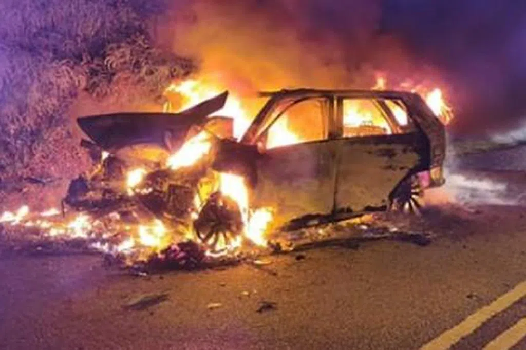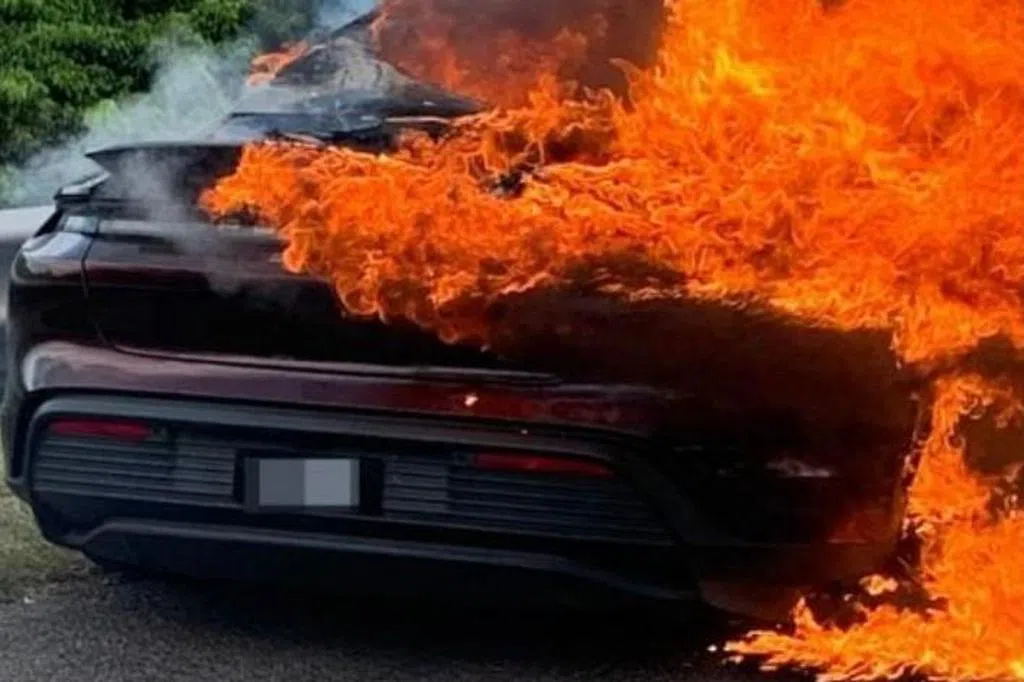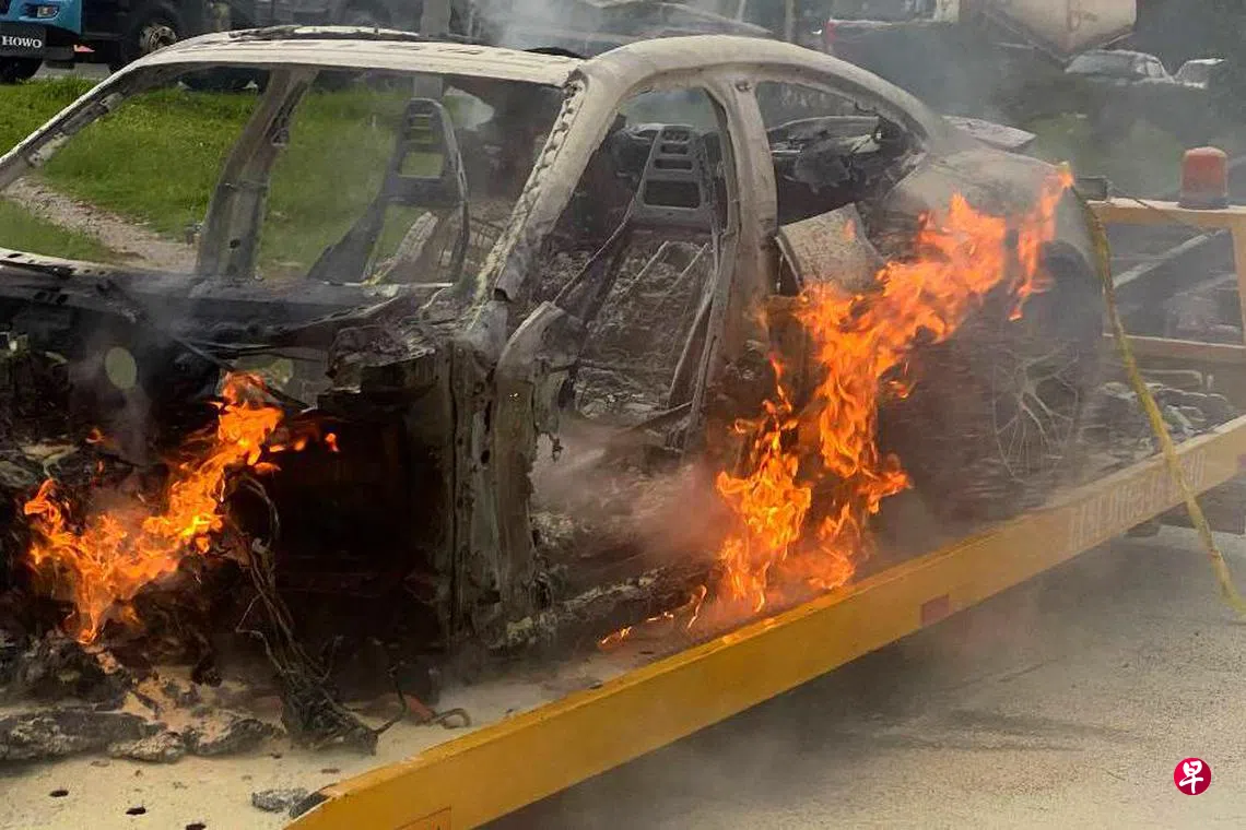 一辆拖车上载着的保时捷名贵车意外起火,烧毁程度高达80%,无人伤亡。