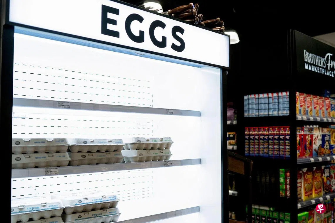 根据价格报告服务商Expana的基准指标,星期三(2月26日)一打大号白壳鸡蛋的价格为8.58美元(约11.51新元),与前一天创下的纪录高位持平。上一次价格持稳时,一打鸡蛋仅售3.93美元(约5.27新元)。一年前的价格为2.97美元(约3.98新元)。