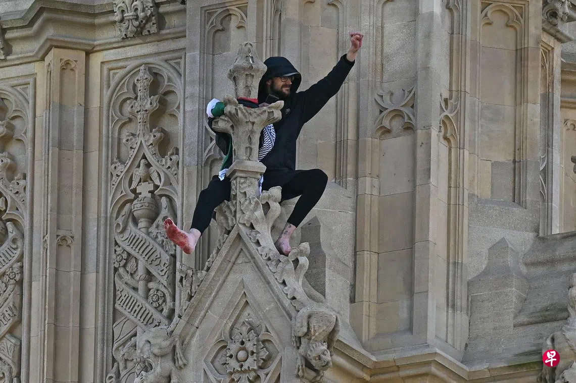英国伦敦一名男子在当地时间周六(3月8日)早上爬上著名地标大本钟(Big Ben)挥舞巴勒斯坦旗帜,并呼喊“解放巴勒斯坦”。英国警方抵步后封锁现场,与男子僵持数小时。