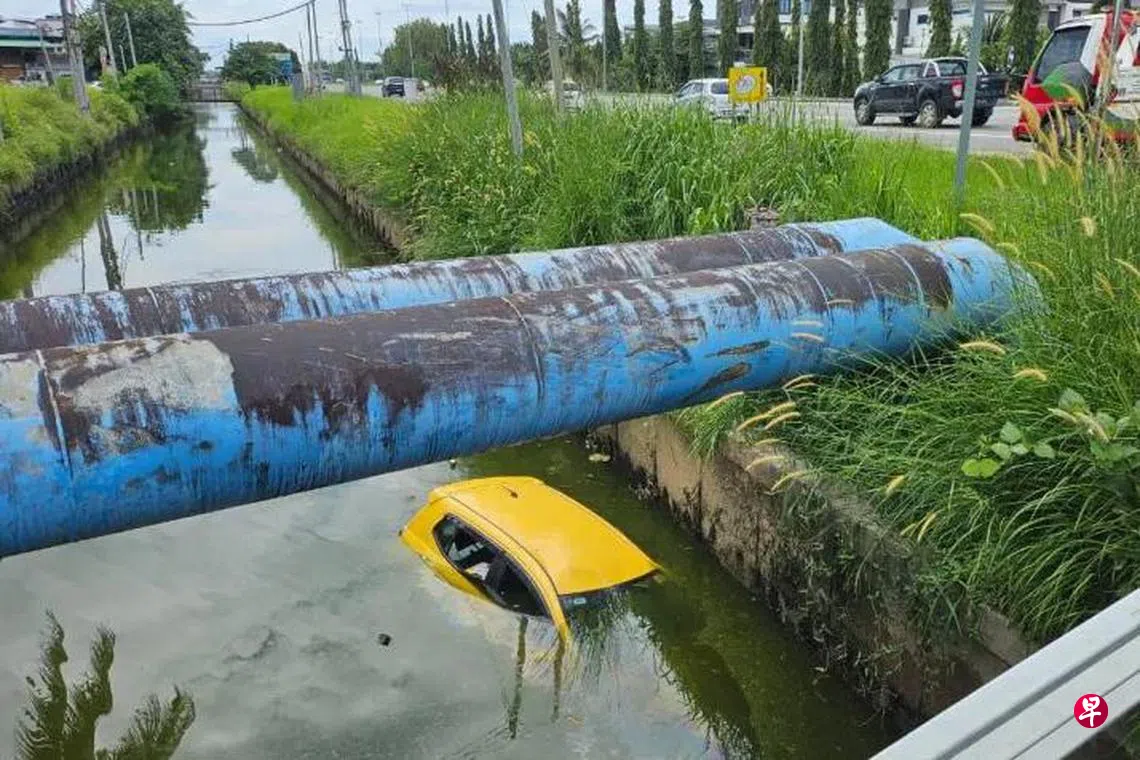 马来西亚沙巴州首府亚庇一辆轿车失控,撞破围栏坠入大沟渠没顶,庆幸女驾驶及时游出水面,身受轻伤送院治疗。