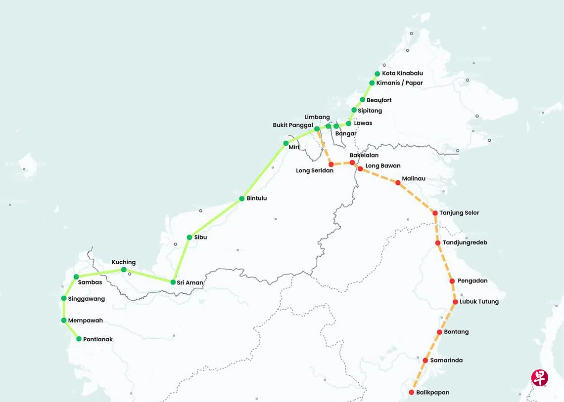 根据计划,这个横跨三个国家的跨婆罗洲高铁将设立24个站点和四个终点站,全长1620公里,列车速度预计为每小时300公里至350公里。项目的第一阶段将从加里曼丹的坤甸出发,途经砂拉越州首府古晋、诗巫、民都鲁和美里等主要城市,一直延伸至沙巴州首府亚庇。第二阶段将贯穿北加里曼丹和东加里曼丹,并最终连接到印尼的新首都努山达拉。两条线路都将交汇于文莱都东区(Tutong),成为铁路的中心枢纽。