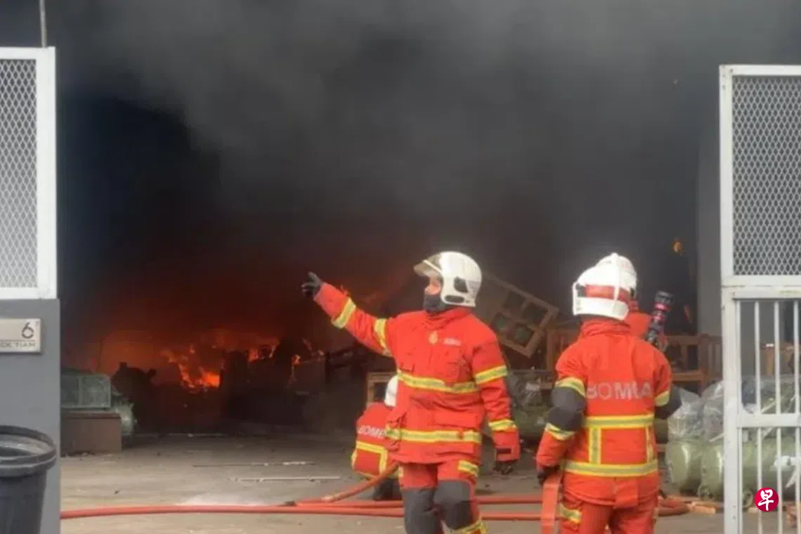马来西亚雪兰莪州蒲种工业区发生严重火灾,至少五家工厂被大火烧毁,浓烟滚滚直冲天际情况骇人。