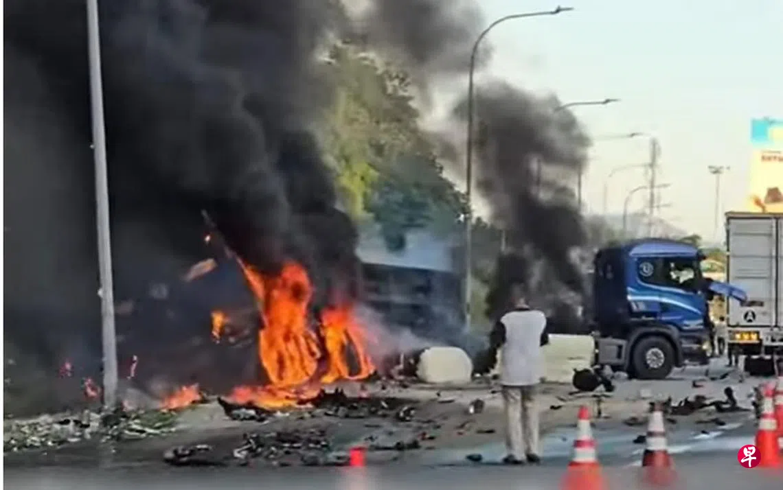 马来西亚霹雳州三辆罗里在大道休息站路口连环撞,罗厘随后起火狂烧,浓烟冲天。