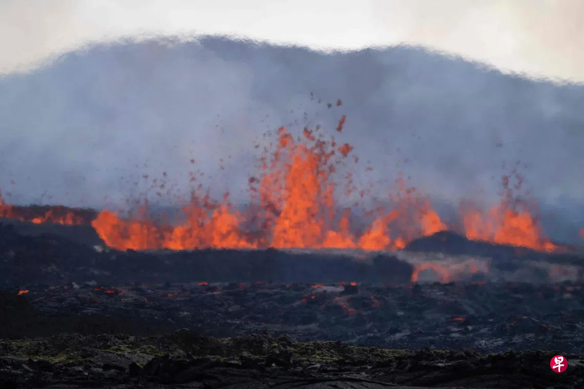 冰岛首都雷克雅未克南部的一座火山爆发,喷涌出熔岩和烟雾,呈现出橙色和红色的火焰景象,游客和居民紧急撤离,但空中交通照常运行。