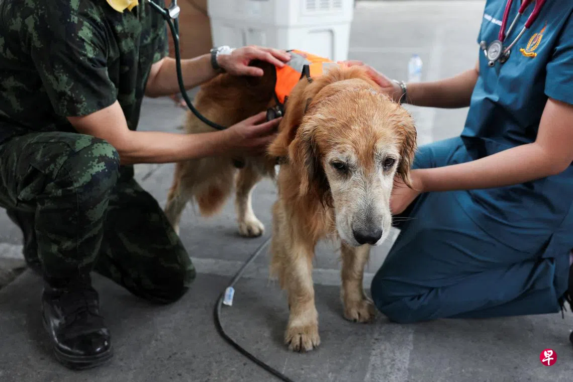 泰国的两只救援犬星期三(4月2日)短暂转换角色,为曼谷大楼倒塌事故中失踪人员的家属提供情感支持。