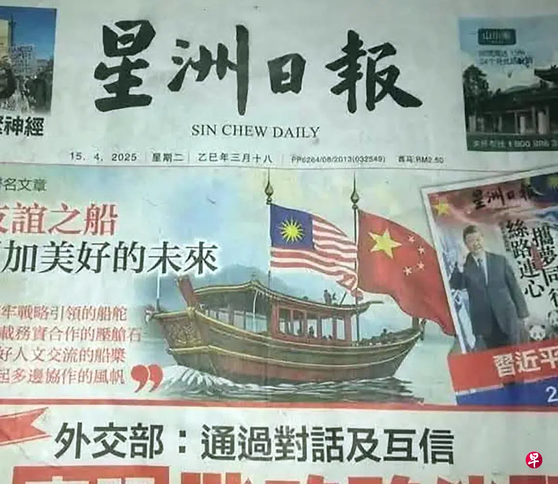 配合中国国家主席习近平访马,《星洲日报》星期二(15日)在封面刊登一张插图,图中一艘船上高挂马中两国国旗,但马国国旗却不见象征国家官方宗教回教的新月图案。
