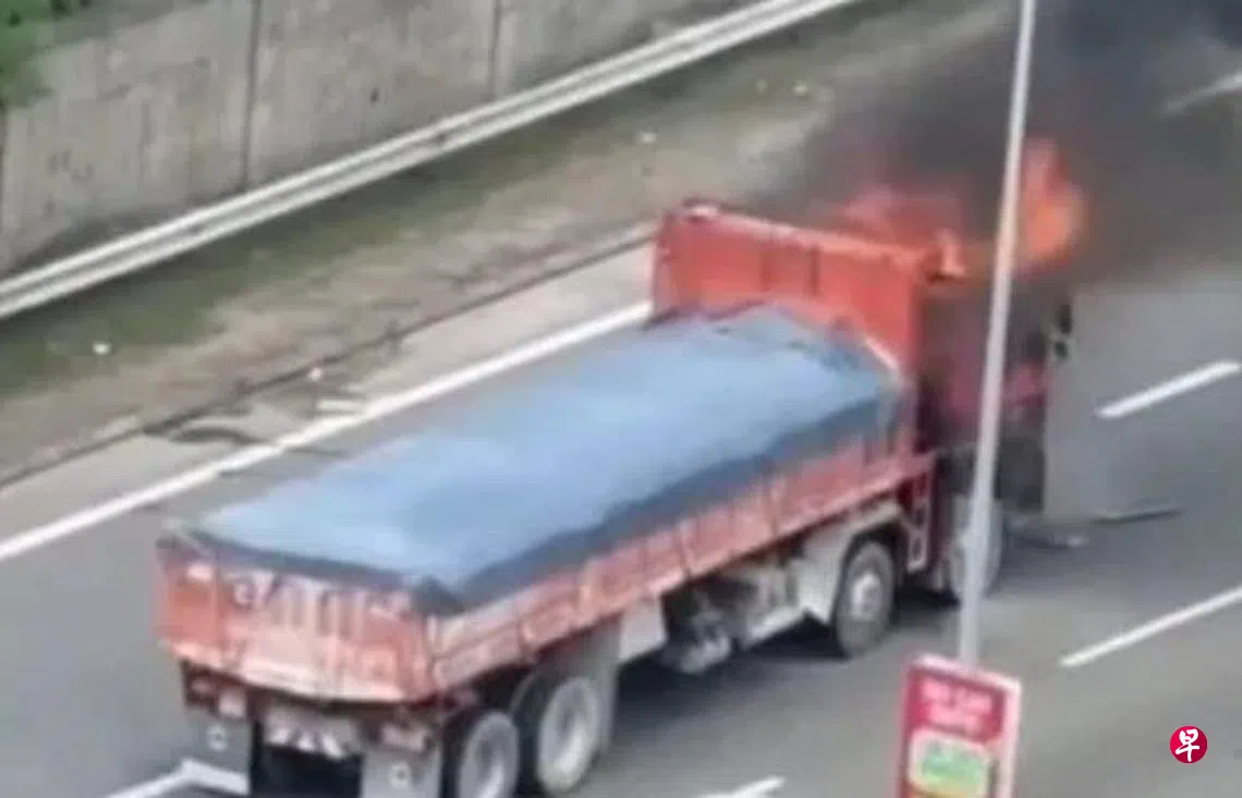 马来西亚一辆运载沙石的罗厘不知何故起火燃烧,所幸未酿成伤亡事故。