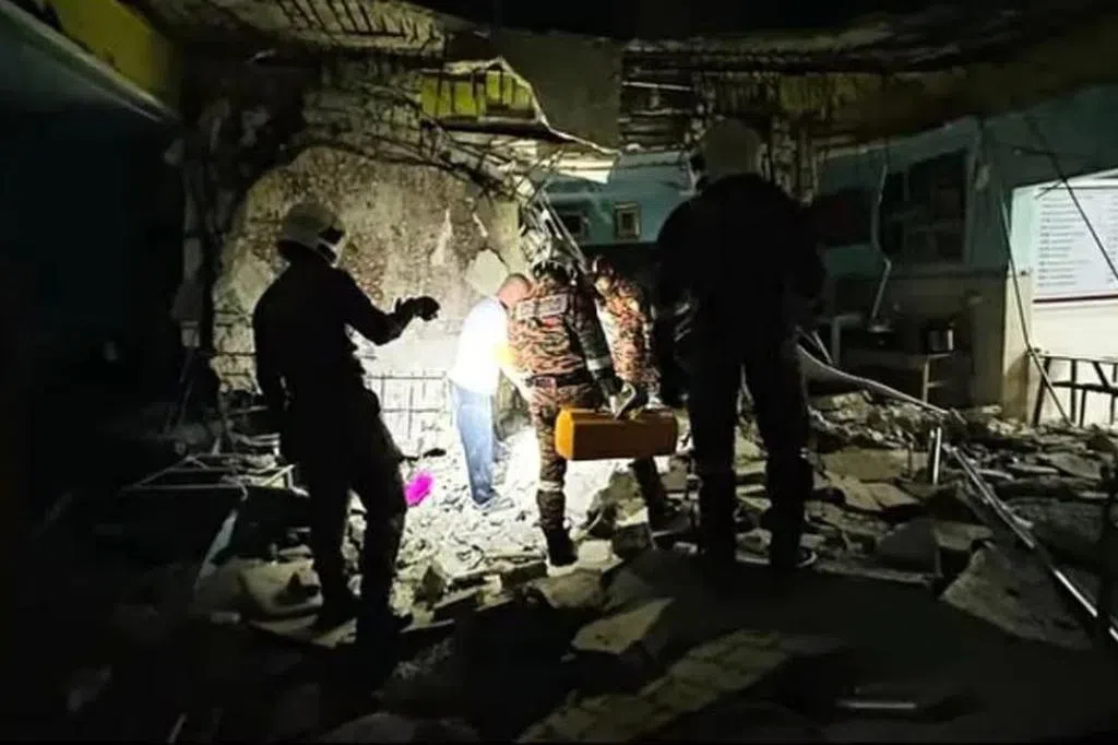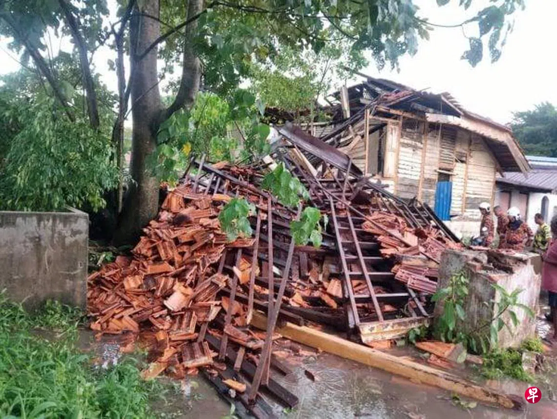 马来西亚怡保发生大雨,五名男子在一间废弃空屋避雨,结果围墙突然倒塌,其中四人受伤,包括一人手骨折断。