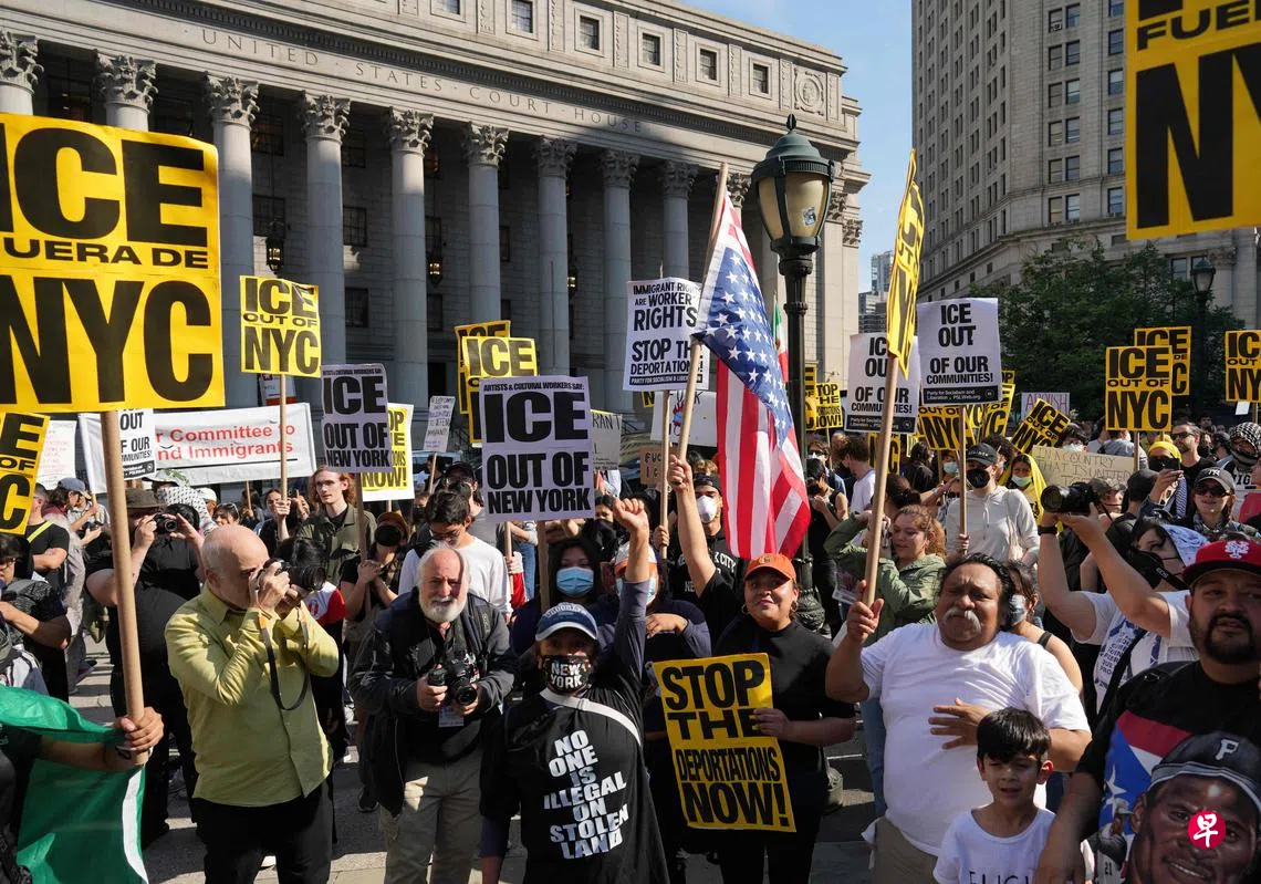抗议队伍随后游行到曼哈顿下城,许多人举着写有“海关和移民执法局(ICE)滚出纽约”的标语牌。一名女性抗议者告诉记者:“我来这里是为了替那些目前无法发声的人说话,尤其是我的母亲。”