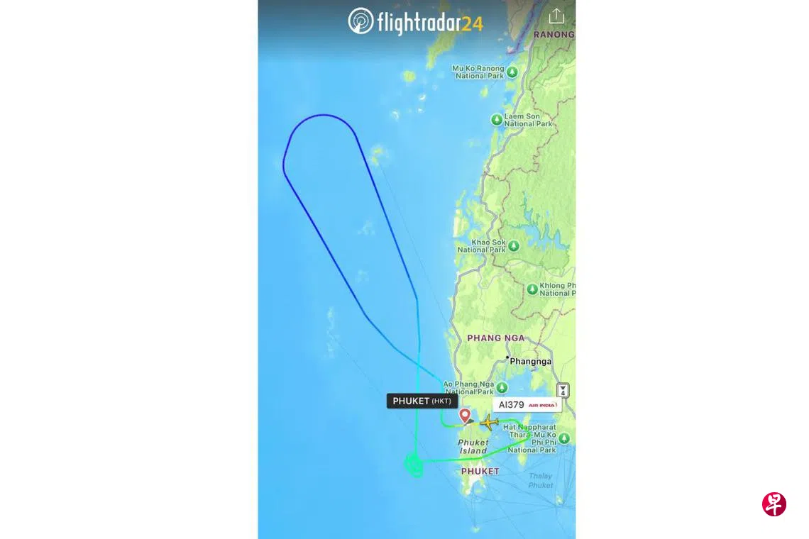 航班追踪网站Flightradar 24的信息显示,这架飞机于星期五(6月13日)上午9时30分(新加坡时间星期五上午10时30分)从普吉岛机场起飞后飞往新德里,但在安达曼海绕了一圈返回普吉岛。