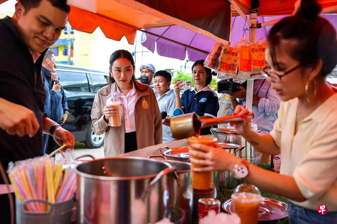 她受到众多支持者的欢迎,其中几名支持者举着一块写着“爱你,佩通坦首相”的标语牌。