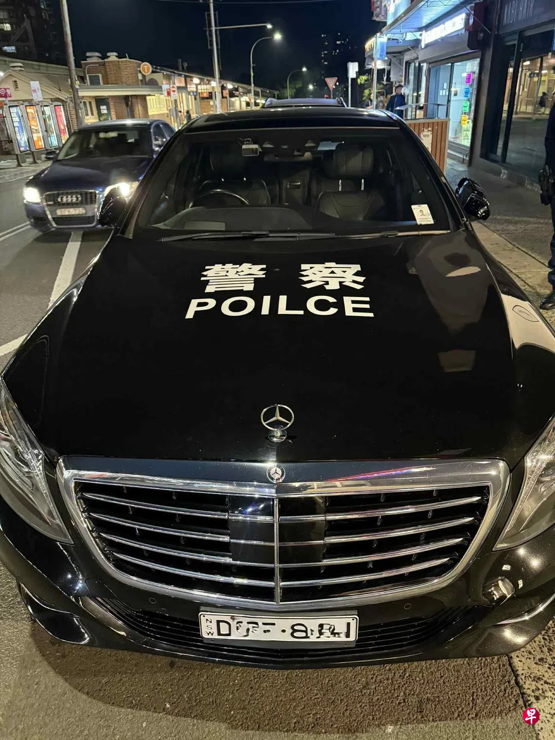 案件起于7月18日下午约2时50分,新南威尔士州警方在一处火车站外巡逻时,发现一辆黑色奔驰轿车停放可疑。车辆外观刻意仿照警车,车身及车牌印有警徽样式图案,并标注中文“公安”与“警察”。尤为引人注意的是,车头盖上以英文拼写“POILCE”——却明显拼错了“POLICE”。