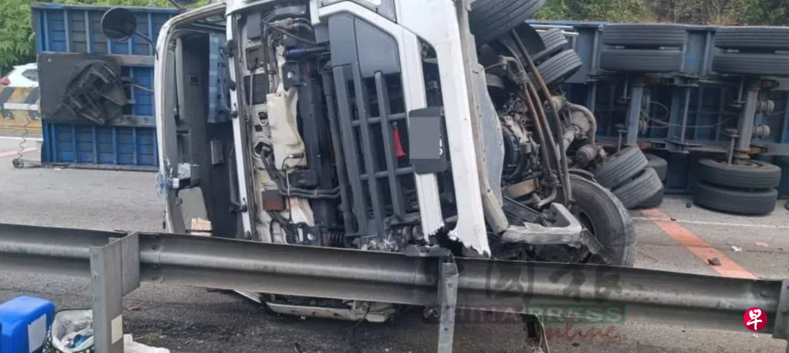 一辆载满洗洁精的拖格罗厘失控翻覆,横陈在马来西亚南北大道,造成交通全面瘫痪,所有往江沙及北部方向的车辆,须改用联邦公路继续行程。