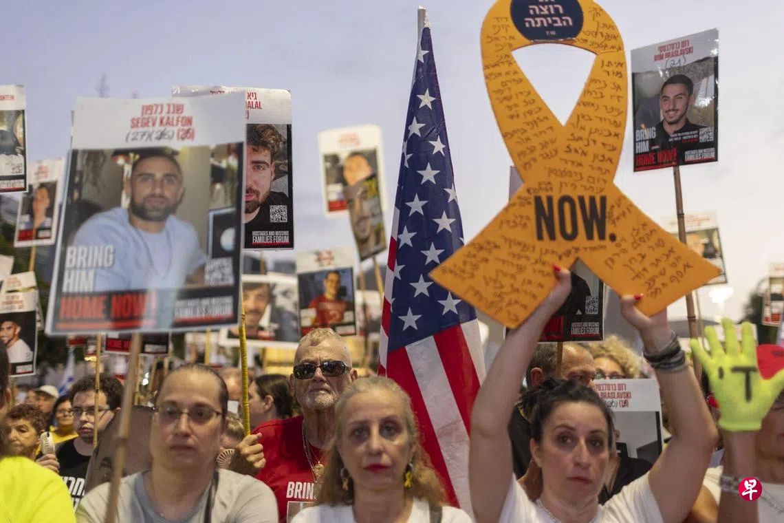 在特拉维夫,示威者举着仍在加沙的人质照片,呼吁政府确保释放他们。
