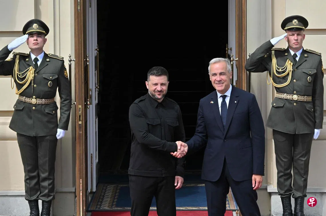 乌克兰总统泽连斯基星期天(8月24日)与加拿大总理卡尼共同庆祝独立日。卡尼说,乌克兰将从下个月宣布的一揽子计划中获得超过10亿加元(约9.27亿新元)的军事援助。