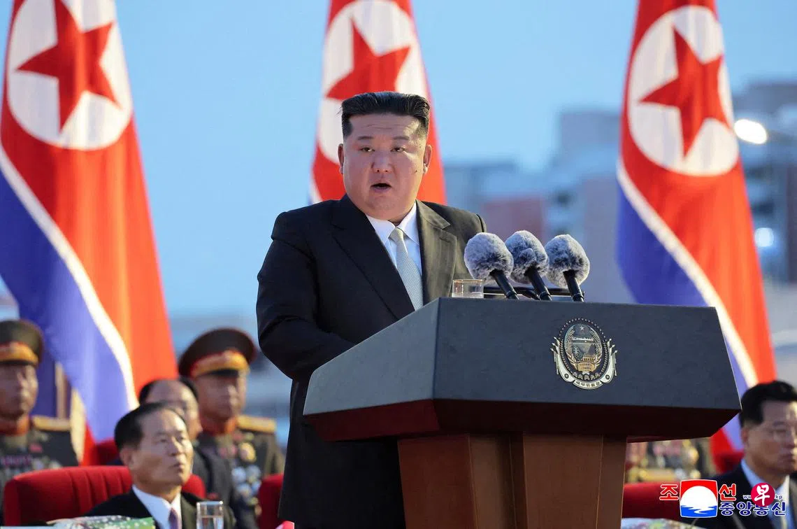 金正恩这次访华,是应中国国家主席习近平邀请,参加9月3日纪念中国抗日战争80周年阅兵式。图为金正恩8月14日在朝鲜庆祝祖国解放80周年大会上发表讲话。 (路透社档案照片)