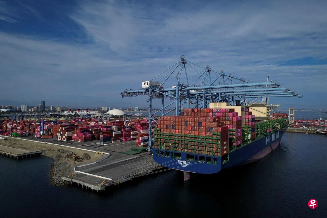 新关税落实前企业竞相进口,美国贸易逆差升至四个月新高。图为8月28日,停靠在美国加利福尼亚州长滩港的HMM Garnet集装箱船。 (彭博社)