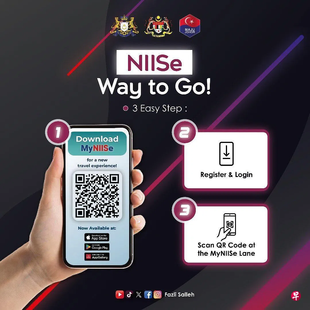 马国籍巴士乘客和电单车骑士目前在柔佛两个陆路关卡使用MyBorderPass手机应用的QR码通关,新的MyNIISe则扩展到私家车驾驶及乘客。当局此前表明,若测试效果良好,政府将逐步淘汰其他QR码通关应用,让MyNIISe成为唯一的QR码通关系统。