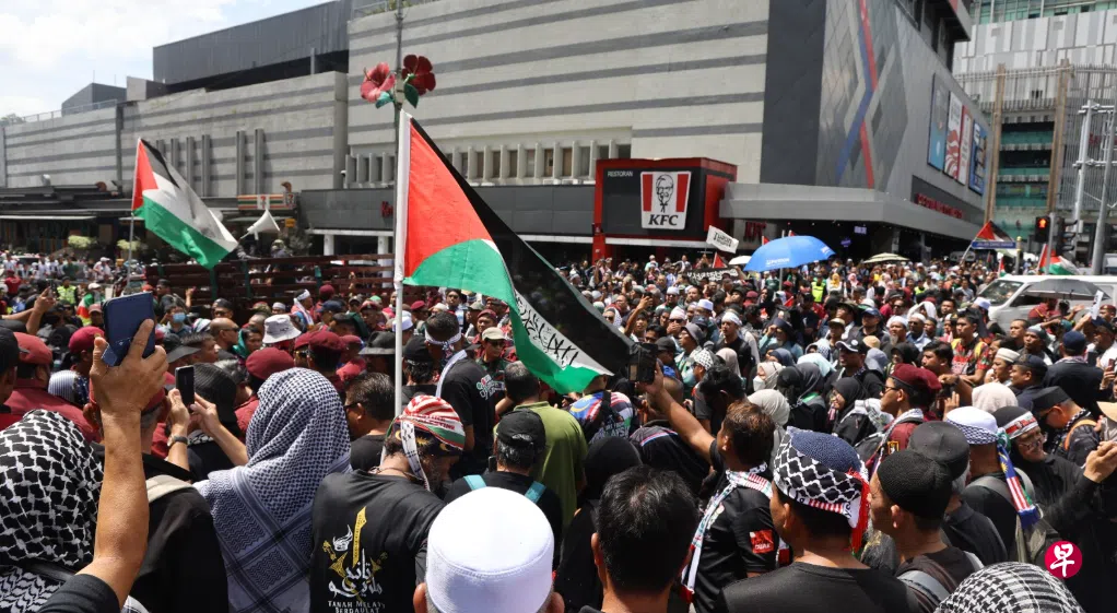 虽然召集时间为星期六下午2时,但据观察,下午1时已见不少人。额头绑着“拯救巴勒斯坦”的布条静坐在商场前一旁的人,相信是在等待政党领袖主持集会和发表演讲。约200名集会者于下午2时陆续从占美清真寺、甘榜塔鲁清真寺和国家清真寺的集合处走向集会地点。