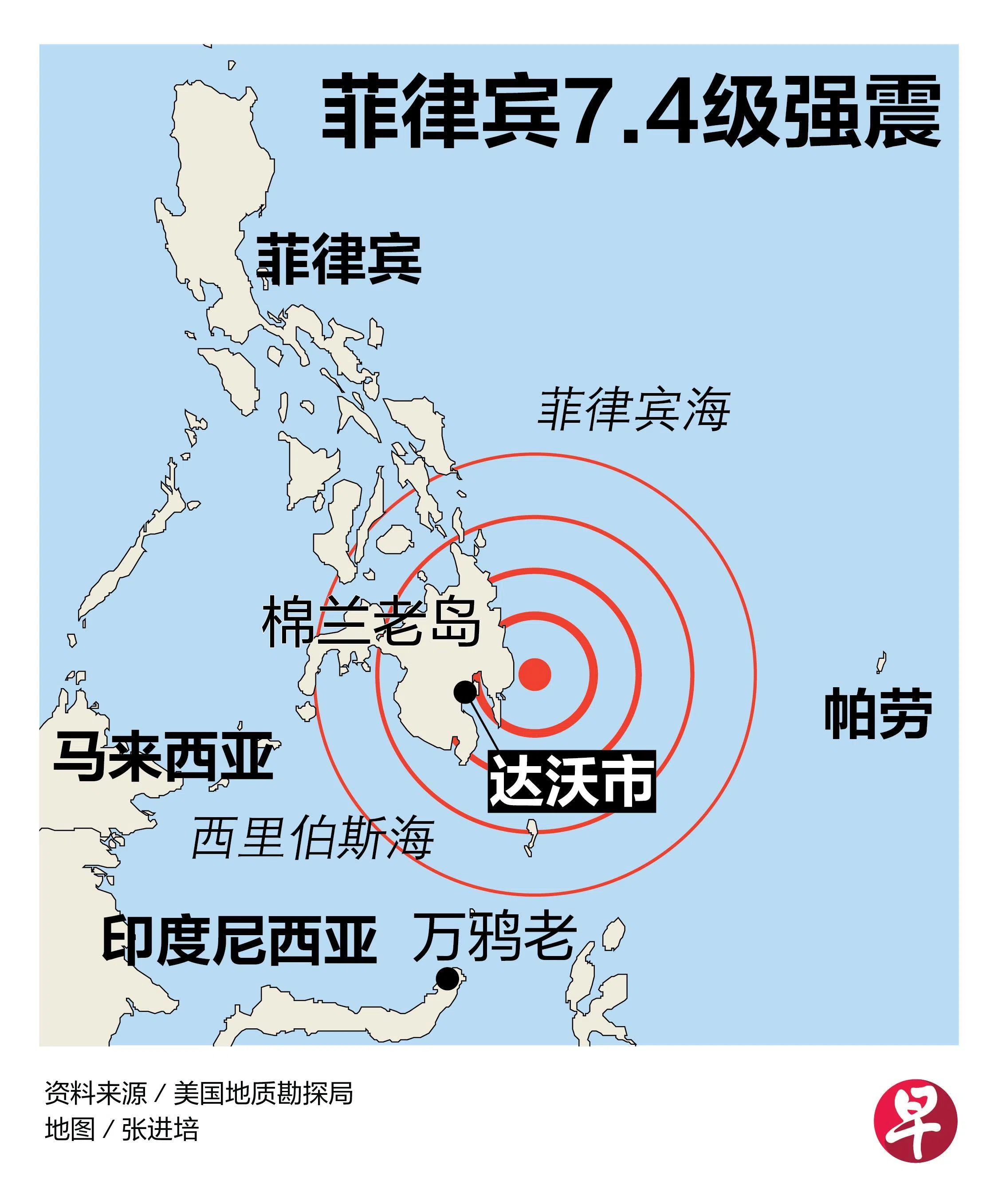 菲律宾棉兰老岛附近海域星期五(10月10日)早上9时43分发生7.4级强烈地震,菲律宾地震局、美国海啸预警系统和印尼地球物理机构都发布海啸预警。