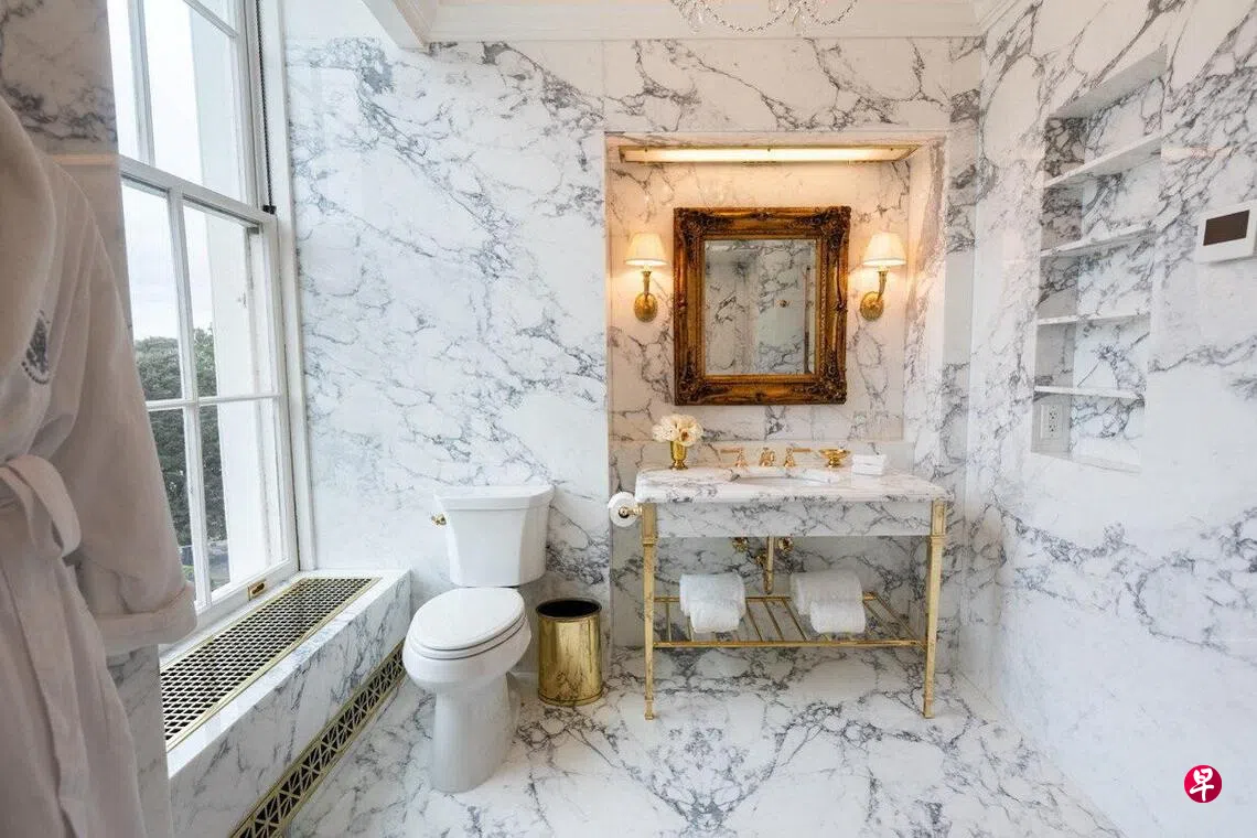 路透社报道,特朗普星期五(10月31日)在社媒平台Truth Social贴出照片,显示林肯卧室(Lincoln Bedroom)里采用黑白抛光大理石的浴室。