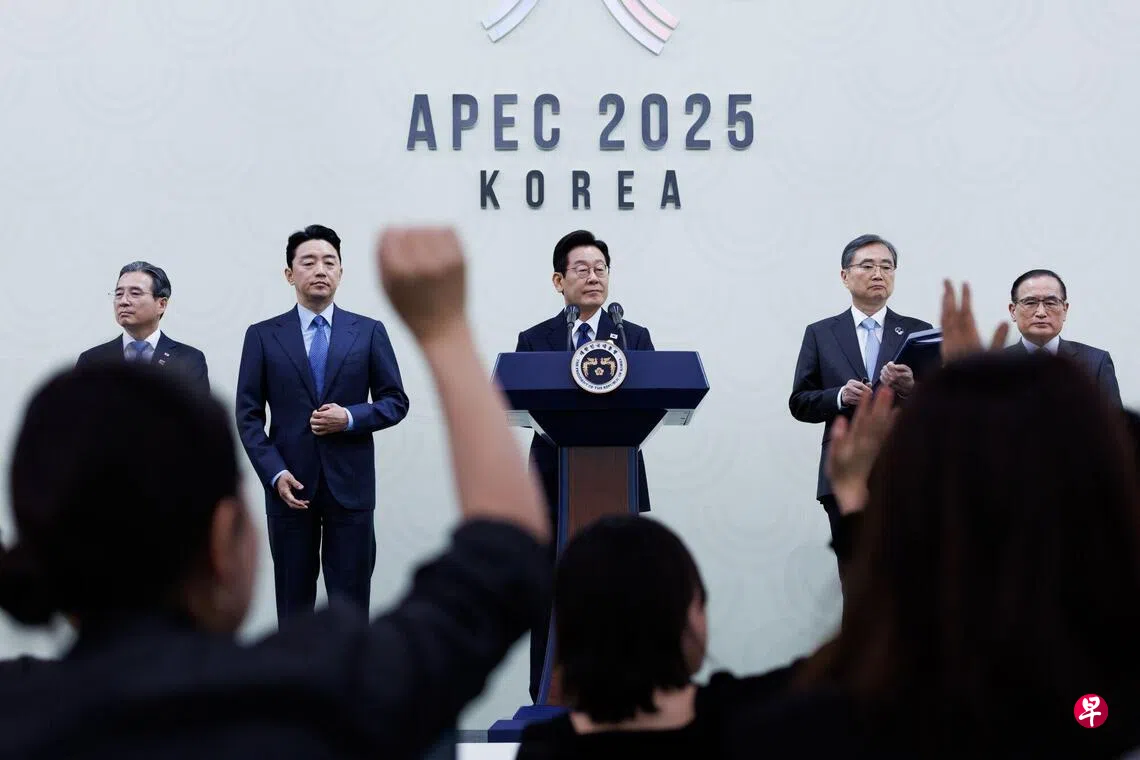 李在明(中)在APEC会后的记者会说,朝鲜怀疑韩国政府,采取敌对行为,要改变朝方态度和思维方式需要长期不懈的努力。 (彭博社)