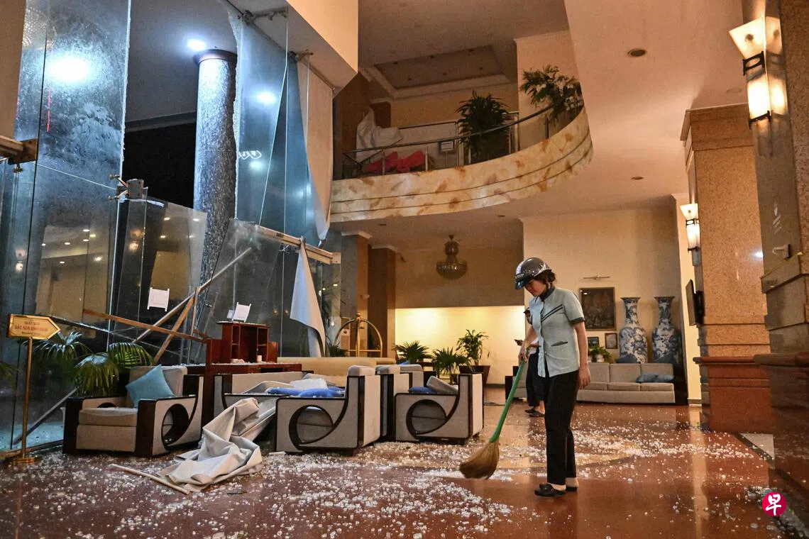 在嘉莱省(Gia Lai)一家酒店大堂的被狂风吹碎。法新社引述48岁的武文浩(Vu Van Hao)说:“我们这里从未经历过如此强风。这是自然灾害,我们又能怎么办呢?”