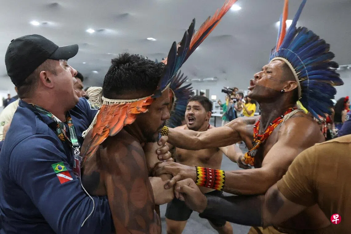 大批示威者包括数十名原住民抗议者强行闯入巴西联合国气候变化大会会场蓝色区域入口处,与保安人员发生冲突,造成两名保安人员受伤。