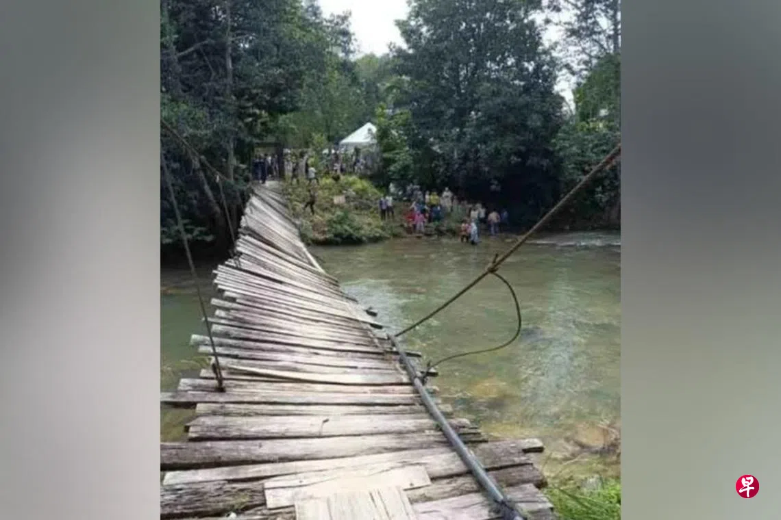 马来西亚吉兰丹州一个新郎迎亲队伍与宾客在吊桥相遇,吊桥疑不堪负荷下坍塌,逾50名宾客坠入河中,喜庆之旅变惊险之行。
