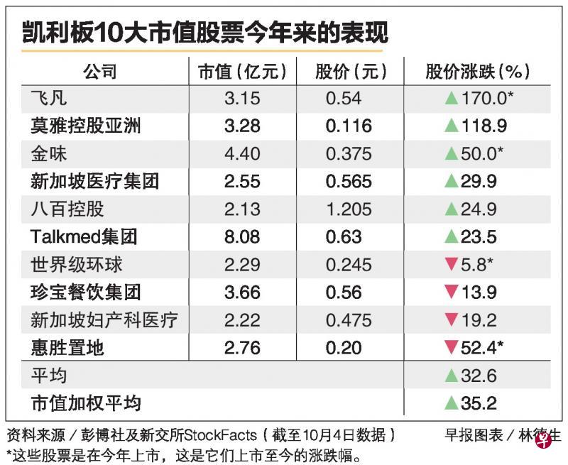 新交所凯利板市值10大股票今年来表现胜过海峡时报指数。截至周三闭市,凯利板市值10大股票今年来的市值加权平均股价涨幅为35.2%,远高于海指的12.4%。