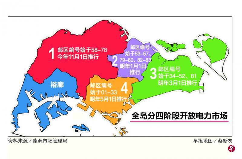 蔡厝港、兀兰等西北部居民可从11月1日起选择电力零售商;榜鹅、盛港等东北部居民是明年1月1日起;淡滨尼等东部地区的居民须等到明年3月1日;大巴窑、中峇鲁一带的中南部地区居民排在明年5月1日。