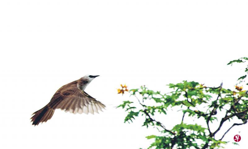 不规则地重复着上上下下的动作,原来下雨时躲在花丛里的昆虫,这时刚要飞离花丛,而黄臀鹎正在捕食。那伶俐美妙的动作,看来像空中芭蕾舞。
