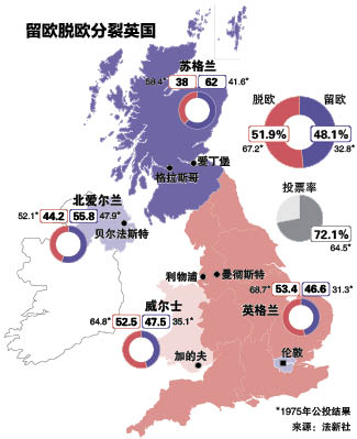6月23日的公投结果显示,在苏格兰、北爱尔兰地区,支持“留欧”的投票者更多,而在威尔士地区和英格兰地区,选择“脱欧”的投票者占优势。