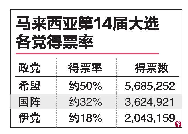(吉隆坡综合讯)马来西亚第14届大选落幕,赢得中央政权的希盟及亲希盟政党的得票率约50%,国阵约32%,伊斯兰党约18%。