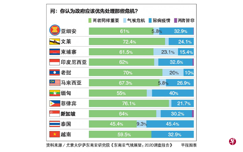 受访者当中,有61%认为应该同时优先处理冠病疫情和应对气候变化、32.9%认为处理疫情更重要。在冠病疫情较轻的国家(报告撰写时)中,柬埔寨和老挝的受访者甚至认为处理气候情况比应付疫情更为迫切。