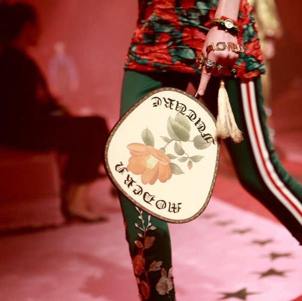 继2016秋冬女装系列的“中国风”后,上月21日的2017春夏米兰时装周上,意大利品牌古驰(GUCCI)继续将中国元素纳入服装系列,当中有盘扣、立领这些典型的中国服饰细节,还有中国龙、牡丹的刺绣图案,模特手中还拿着绢扇这一具有浓郁东方属性的物品,整场T台秀上,东西方文化碰撞出精彩火花,颇令人玩味。