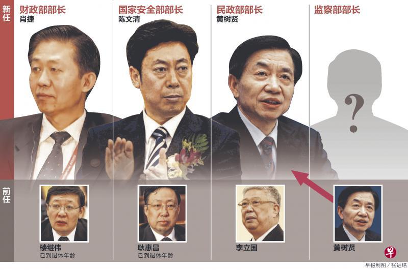 继多个省市地方大员调整之后,中国一些中央部委也迎来“一把手”变动。全国人大常委会昨天宣布,任命陈文清为国家安全部部长、黄树贤为民政部部长、肖捷为财政部部长。
