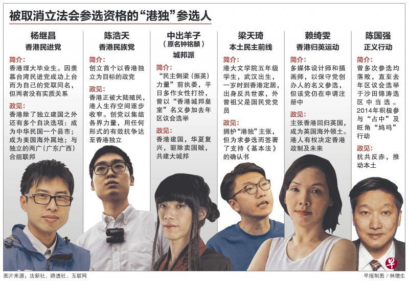 除梁天琦外,其余被指支持“港独”而给取消参选资格者包括:“香港民进党”杨继昌、“香港民族党”陈浩天、“城邦派”中出羊子、“香港归英运动”召集人赖绮雯及本土派组织“正义行动”的陈国强。
