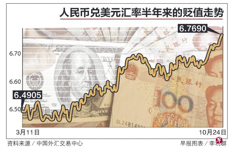 (上海/北京综合讯)人民币兑美元汇率昨天跌破6.77,使本月的贬值幅度达到1.36%。在岸人民币今年则已贬值4.1%,跌幅居亚洲首位。
